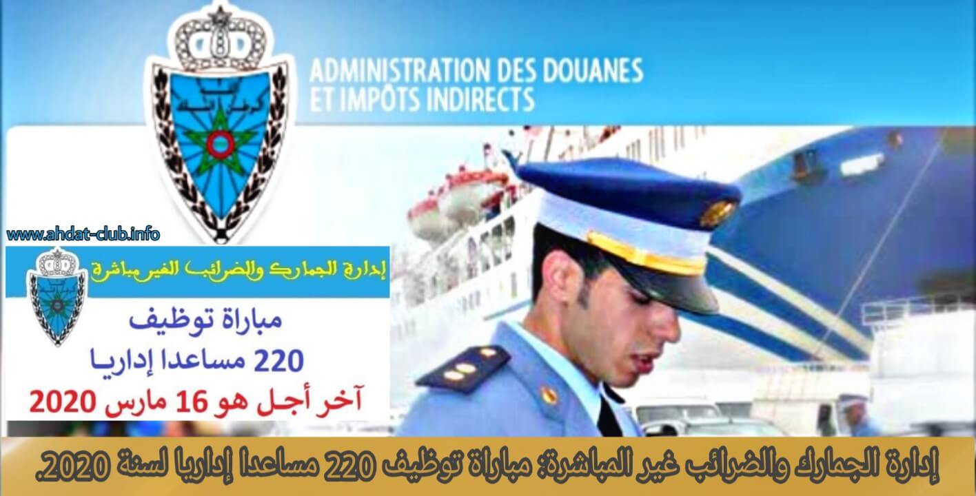 إدارة الجمارك والضرائب غير المباشرة مباراة توظيف 220 مساعدا إداريا لسنة 2020