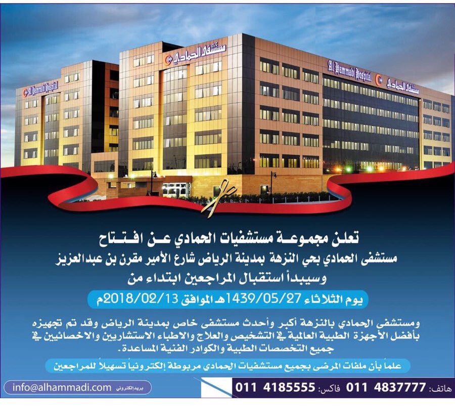 خبر عاجل On Twitter مجموعة مستشفيات الحمادي تعلن عن افتتاح مستشفى الحمادي بحي النزهة بمدينة الرياض شارع الأمير مقرن بن عبدالعزيز وسيبدأ استقبال المراجعين ابتداء من يوم الثلاثاء 1439 05 27هـ الموافق 2018 02 13م لمزيد
