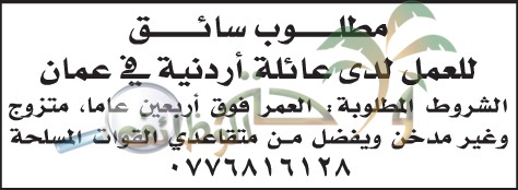 مطلوب سائق خاص للعمل لدى عائلة اردنية في عمان