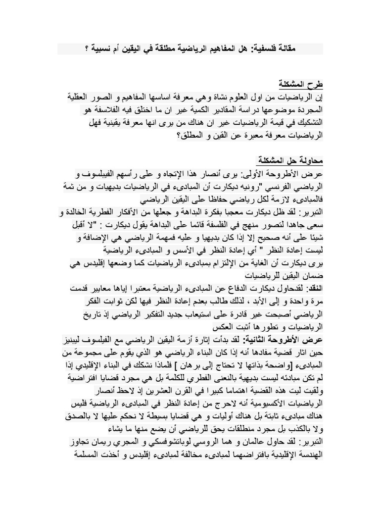 مقالة فلسفية هل المفاهيم الرياضية مطلقة في اليقين أم نسبية موقع شريعة التعليمي